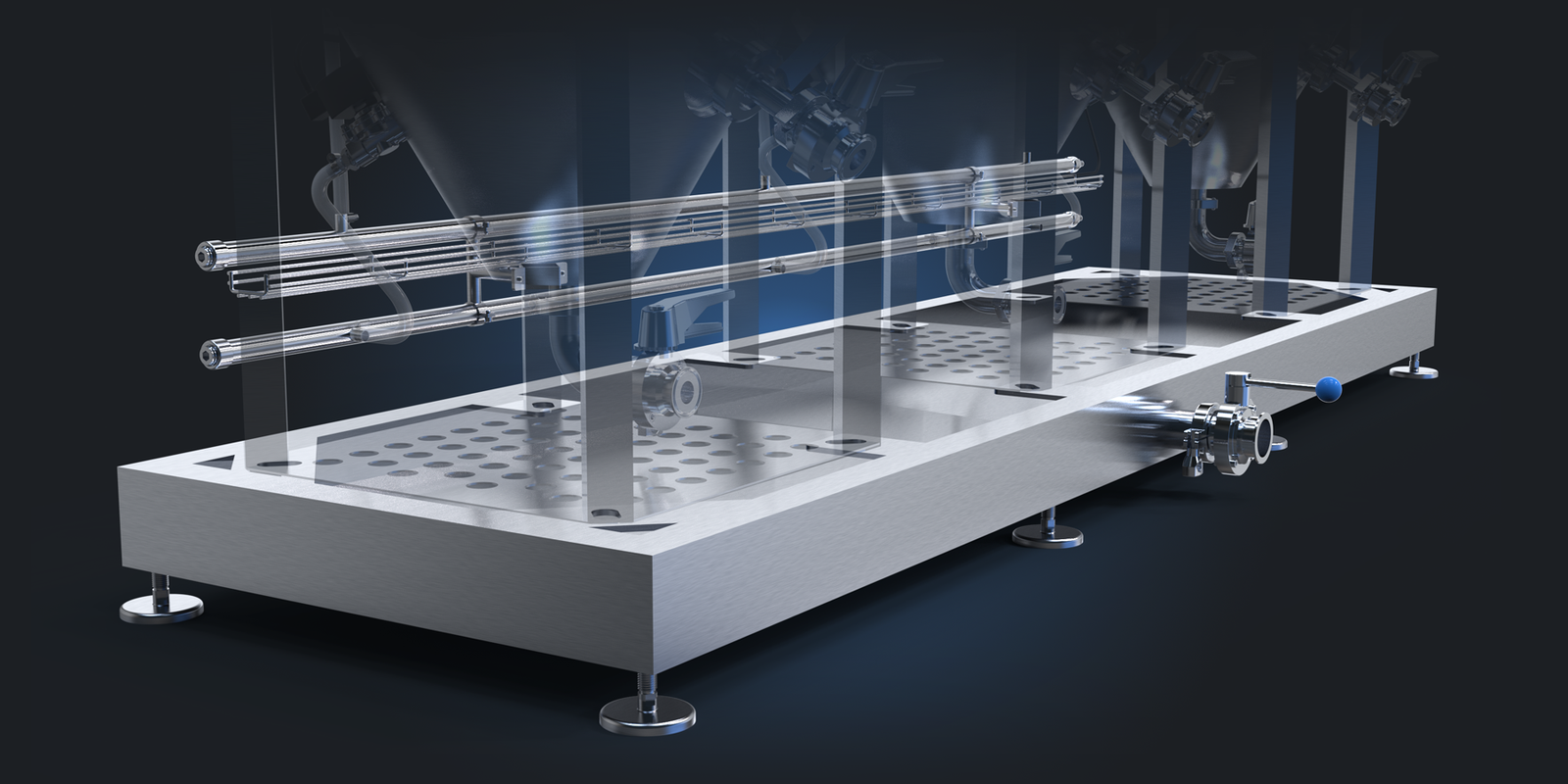The base of the Cold Side Skid features a sloped Drain Pan and a large 2" TC Port with a Butterfly Valve that allows for easy cleanup of any messes made during transfers, dry hopping, or sampling.