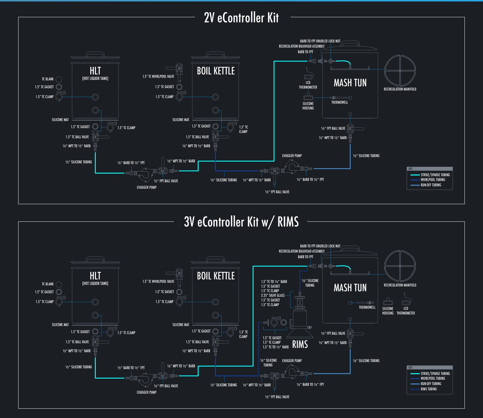 Designed to be used with a recirculating infusion mash system (RIMS). The 3V controllers is engineered to be used with a traditional 3 vessel, multi-step mash system, where each vessel can be temperature controlled. The 3V controller is designed to operate 3 elements in total, albeit 2 at a time, and will be compatible with our 10 and 20 gallon eKettles. As a result of the increased load of running 2 elements simultaneously, the 3V controller will require two discrete 30A GFCI protected circuits.