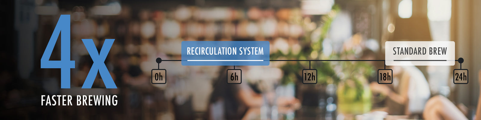 The Cold Brew Recirculation System recirculates the coffee during the brew cycle to extract more flavor in less time. Typical Brew times are reduced from 16 hours to as little as 4 hours.
